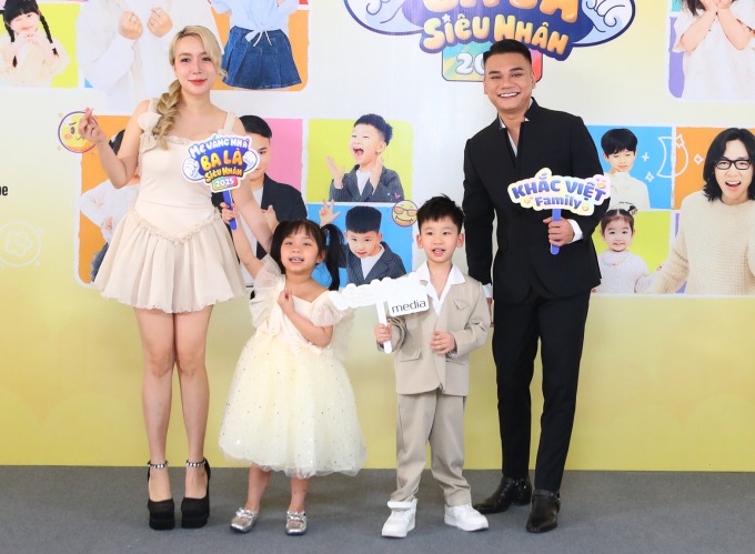Vợ chồng Khắc Việt - Thanh Thảo và hai con sinh đôi ở họp báo giới thiệu show "Mẹ vắng nhà, ba là siêu nhân", chiều 25/3 ở Hà Nội. Ảnh: Ban tổ chức cung cấp