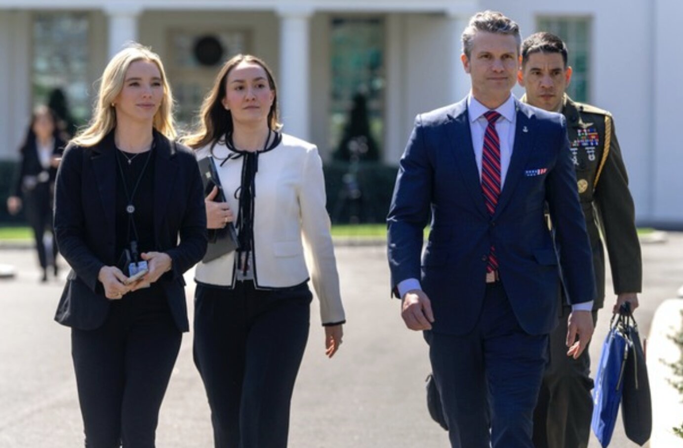 Bộ trưởng Quốc phòng Pete Hegseth (thứ hai từ phải sang) đi bộ bên ngoài Nhà Trắng, ngày 21/3. (Ảnh: AP)