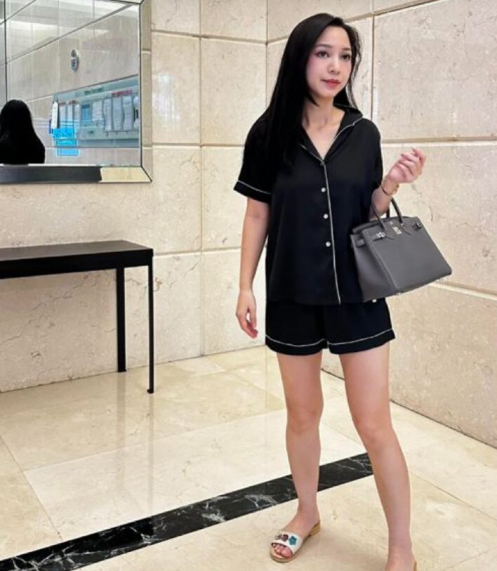Cô đăng 1 bức ảnh đứng dưới sảnh toà nhà đang sống, mặc nguyên bộ đồ ngủ, trên tay cầm chiếc túi Hermes.
