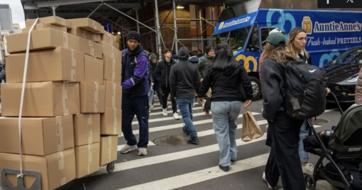 Một nhân viên giao hàng của FedEx đẩy xe đẩy tay chở hàng ngày 29/11/2024 tại thành phố New York, Mỹ. Ảnh: Getty Images