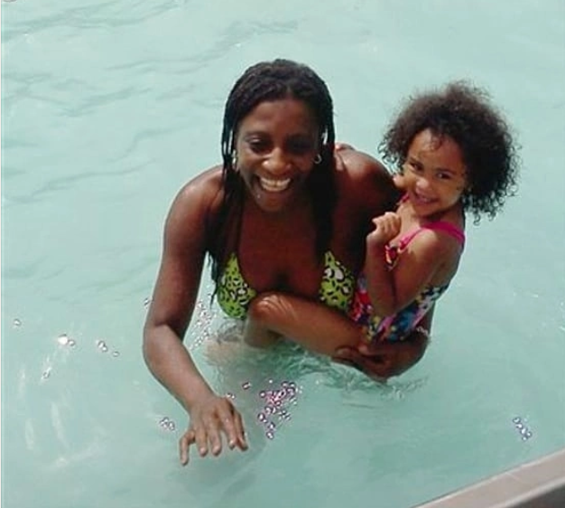 Marie Joseph bế con gái hàng xóm vui chơi trong bể bơi, trước khi gặp nạn. Ảnh: NBC