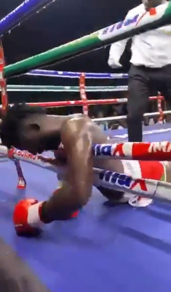Khi đồng hồ điểm chưa đầy ba phút, Oluwasegun bất ngờ lùi lại, tựa vào dây đài rồi đổ sụp xuống sàn. (Ảnh: NYPost/X)