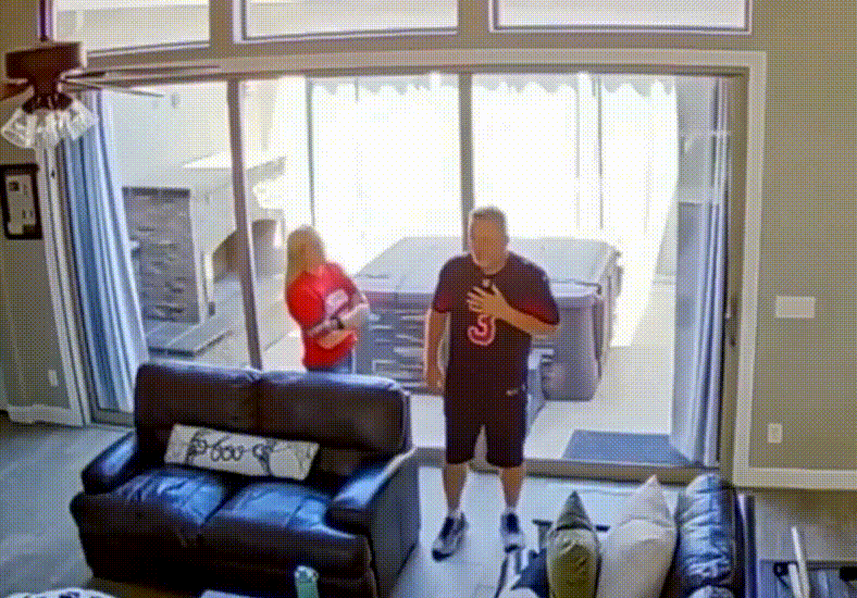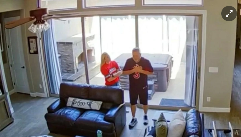 Camera giám sát tại nhà của hai người đã ghi lại được khoảnh khắc bất ngờ này tại phòng khách. "Có cảm giác như thức ăn bị mắc kẹt không, hay cảm giác như...", Michelle Goss bắt đầu hỏi chồng mình trước khi ông loạng choạng, và bà đã đỡ chồng ngồi xuống ghế.