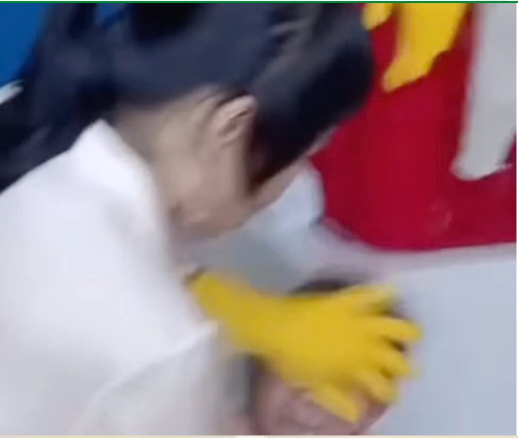 Theo nội dung đoạn clip, cô bảo mẫu dùng 2 tay, 1 tay nắm đầu trẻ ngửa lên, tay còn lại liên tục đổ đồ ăn vào miệng. Ảnh cắt từ clip