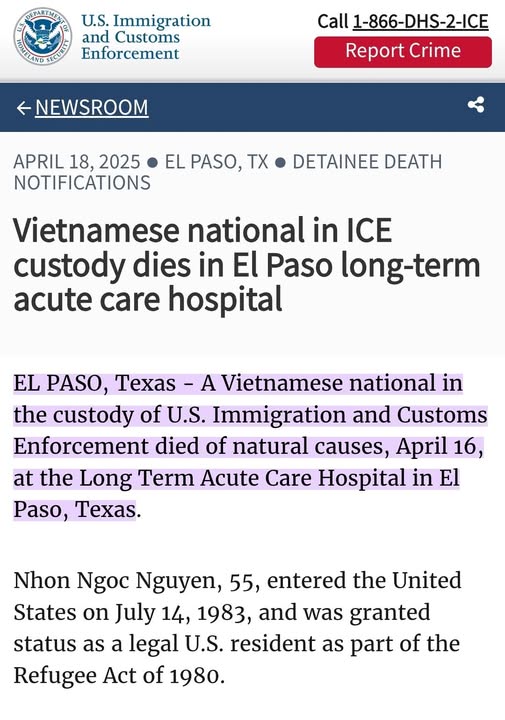 EL PASO, Texas - Một người Việt, đang bị giám sát bởi cơ quan di trú Mỹ trong khi chờ thủ tục trục xuất đã mất theo tình trạng tự nhiên vào ngày 16 tháng 4 tại nhà thương ở El Paso, Texas.