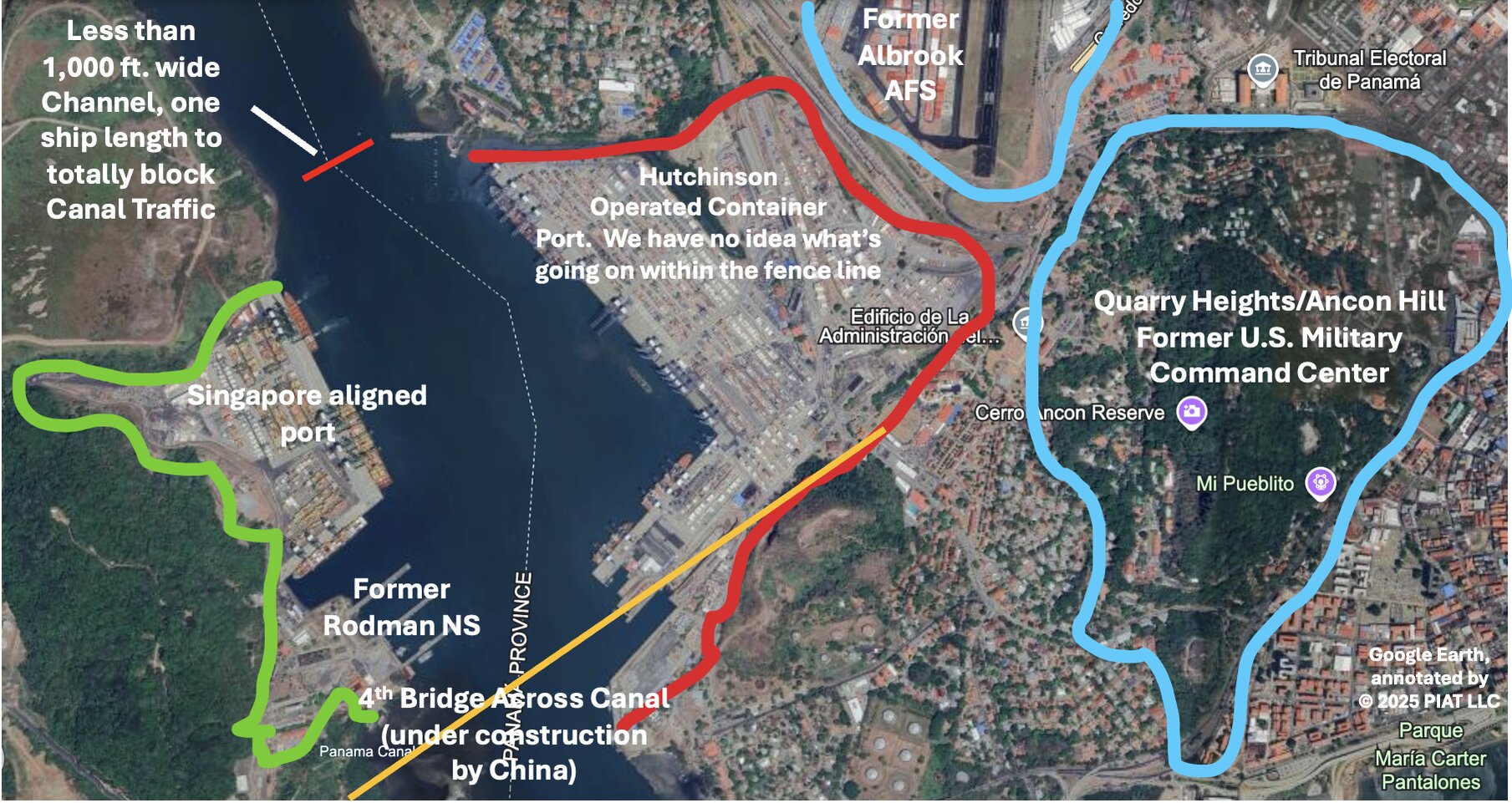Ông cho biết điểm chính xác này tại Cảng Balboa mà Hutchison được nhượng quyền khai thác dài hạn "là một điểm nghẽn" có thể nhanh chóng chặn kênh đào nếu xảy ra sự cố tương tự như vụ va chạm tàu ở Cầu Baltimore năm 2024 hoặc sự cố Kênh đào Suez năm 2021 khi một tàu container siêu lớn của Đài Loan, Ever Given, không hiểu sao lại chen vào kênh đào Suez, hoàn toàn chặn đường lưu thông trong sáu ngày.