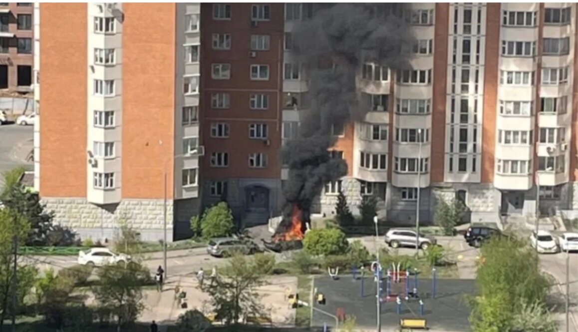 Hiện trường vụ nổ xe hơi tại thành phố Balashikha, tỉnh Moscow, Liên bang Nga, vào ngày 25/4. Ảnh: Kênh Telegram Ostorozhno Moskva