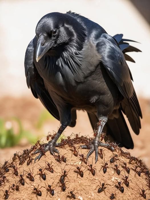 Đúng như bạn đọc. Khi một con quạ cảm thấy không khỏe, nó đậu gần tổ kiến, dang rộng cánh, đứng yên và để kiến tấn công. Chúng làm vậy vì một lý do: