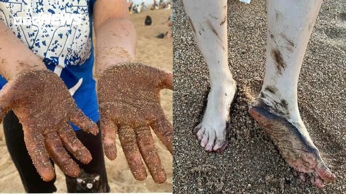 Nhiều du khách tắm biển bị dính dầu vón cục.