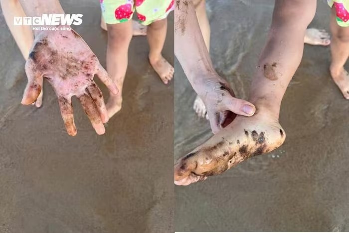 Tương tự, nhiều du khách tắm biển ở khu vực này cũng bị dầu vón cục dính đầy người, đặc biệt là trẻ em tắm gần bờ dính rất nhiều dầu.