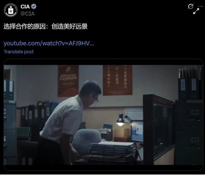 Hai đoạn phim được đăng tải lên các tài khoản mạng xã hội chính thức của CIA mô tả các tình huống hư cấu, trong đó một quan chức cấp cao của Đảng Cộng sản Trung Quốc và một viên chức chính phủ trẻ tiếp cận được thông tin mật, dần trở nên mất niềm tin vào hệ thống và quyết định liên lạc với CIA.