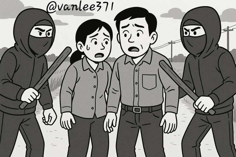 Hai vợ chồng đang đi dạo dưới quê buổi tối, bỗng hai tên cướp bịt mặt cầm vũ khí nhảy ra: