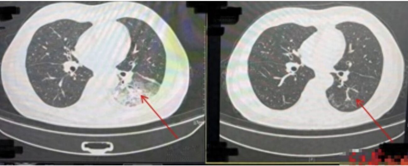 Ảnh chụp CT trước khi điều trị cho thấy nửa lá phổi trái của ông Lý trắng xóa (bên trái) và ảnh chụp CT phổi sau khi điều trị khỏi (bên phải).
