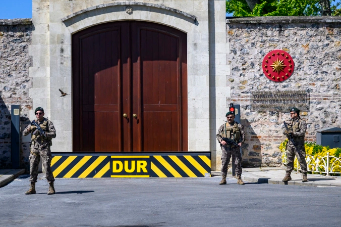 Lực lượng an ninh Thổ Nhĩ Kỳ đứng gác ngoài Cung điện Dolmabahce ở Istanbul ngày 15/5. Ảnh: AFP
