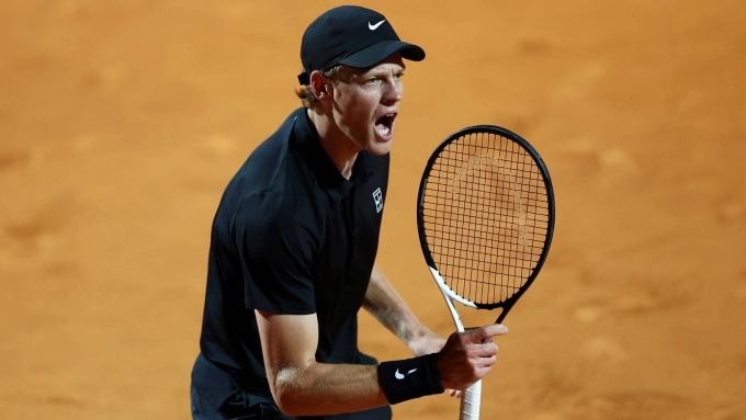 Sinner mừng chiến thắng sau trận bán kết Rome Masters, trên sân Trung tâm ở tổ hợp Foro Italico hôm 16/5. Ảnh: Reuters