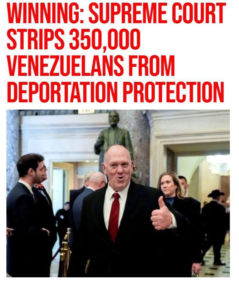 Cùng ngày hôm nay chính phủ Trump cũng ra lệnh trục xuất 350,000 người Venezuela, cộng thêm 150,000 người Cuba và Haiti. Lệnh trục xuất này đã có từ tháng trước nhưng bị kiện tụng , cho đến sáng nay khi Tối cao pháp viện tuyên bố chính phủ Trump có quyền trục xuất với số phiếu 8/1.