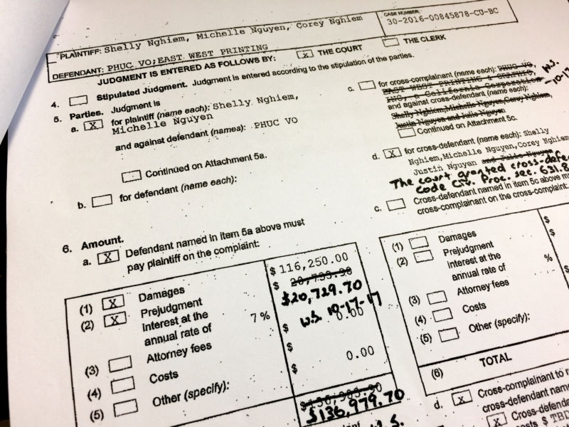 Theo phán quyết ngày 17 Tháng Mười của Chánh Án Walter Schwarm thuộc Tòa Thượng Thẩm California, County of Orange, ông Phúc Võ (East West Printing), bị cáo, phải bồi thường tổng số tiền là $136,979.70 (trong đó gồm cả tiền lời 7% là $20,729.70) cho các nguyên đơn, gồm Shelly Nghiêm, Michelle Nguyễn, Corey Nghiêm, và Justin Nguyễn trong vụ kiện số 30-2016-00845878-CU-BC.