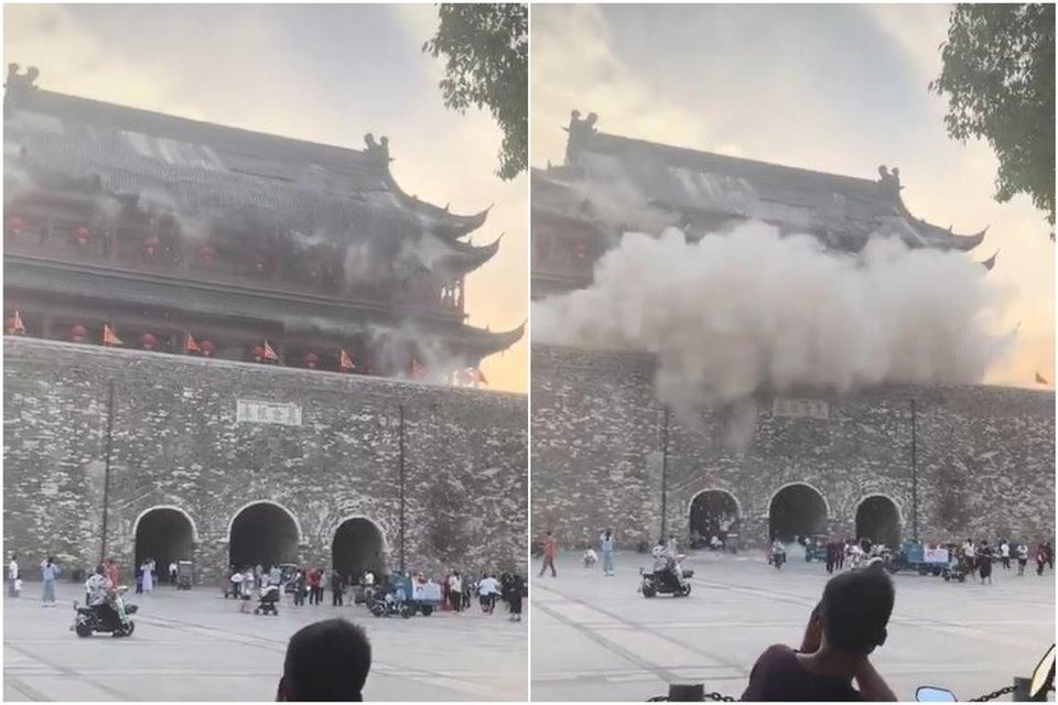 Mạng xă hội Trung Quốc đang lan truyền đoạn video ghi lại cảnh một phần mái ngói của toà tháp 650 năm tuổi bất ngờ đổ sập suưt rơi trúng vào khách du lịch.