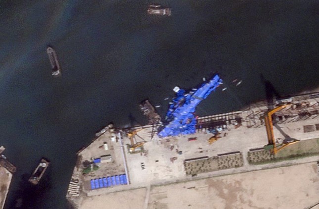 Trung tâm Nghiên cứu chiến lược và quốc tế (CSIS) tại Mỹ dựa vào ảnh vệ tinh cho biết con tàu nằm nghiêng đang bị phủ bằng bạt màu xanh, phần đuôi vươn ra cảng trong khi phần mũi vẫn c̣n trên đường trượt.