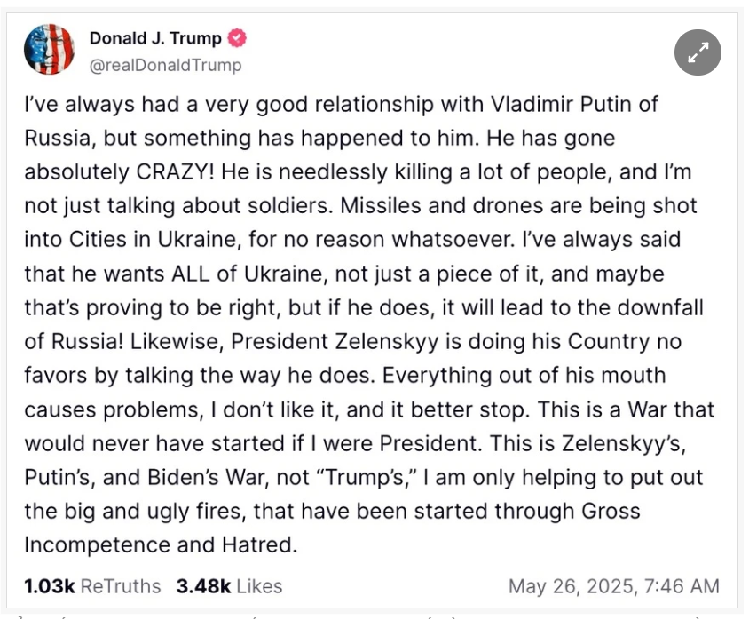 Sáng 26/5, theo giờ Hà Nội, Tổng thống Mỹ Donald Trump viết trên mạng xã hội Truth Social rằng ông luôn có mối quan hệ rất tốt với Tổng thống Vladimir Putin, nhưng đã có điều gì đó xảy ra với nhà lãnh đạo Liên bang Nga.