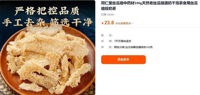 Tuy nhiên, trên gian hàng online của hiệu thuốc “Đồng nhân đường Bắc Kinh”, 100g xơ mướp có giá khoảng 23,8 NDT, tương đương 238 NDT (tương đương 836.000 đồng)/kg. Tại một số gian hàng khác, dược liệu này có giá rẻ hơn song cũng ở mức 120 NDT (khoảng 421.000 đồng)/kg.