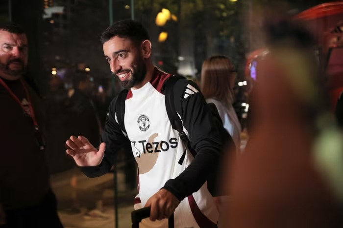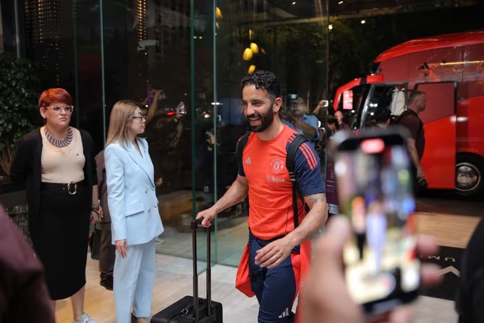 Không khí náo nhiệt, đỏ rực màu áo đấu MU, rộn ràng tiếng hô vang tên các ngôi sao như Bruno Fernandes, Casemiro hay Andre Onana. Đội trưởng Fernandes xuất hiện rạng rỡ, nở nụ cười và thân thiện vẫy tay, ký tặng fan.