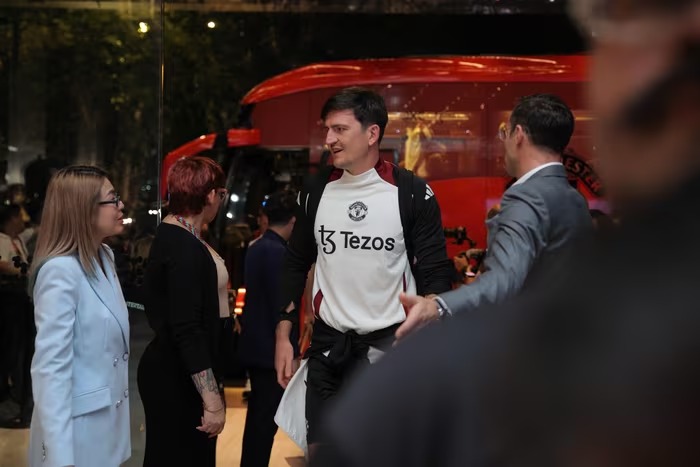 Harry Maguire cùng các đồng đội bước vào khách sạn. Trung vệ người Anh gây chú ý bởi phong thái tự tin và thân thiện.