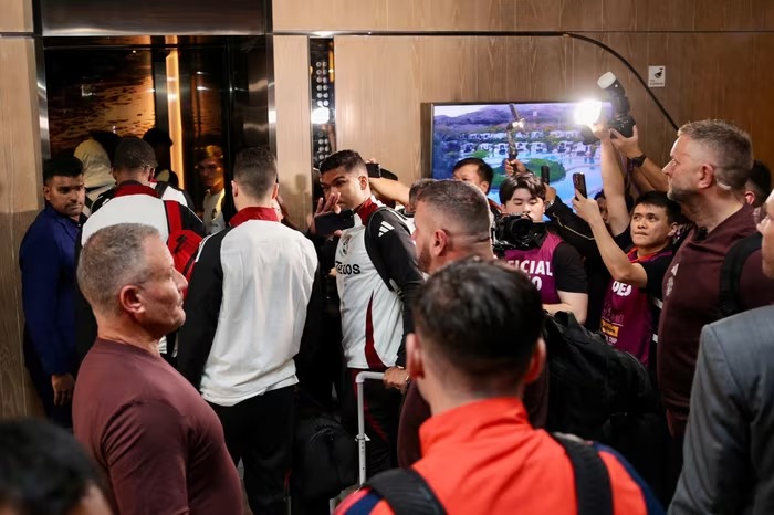 Khoảnh khắc Onana bước qua vòng vây máy ảnh của fan và truyền thông. Không khí náo nhiệt bao trùm khu vực sảnh chờ khách sạn.