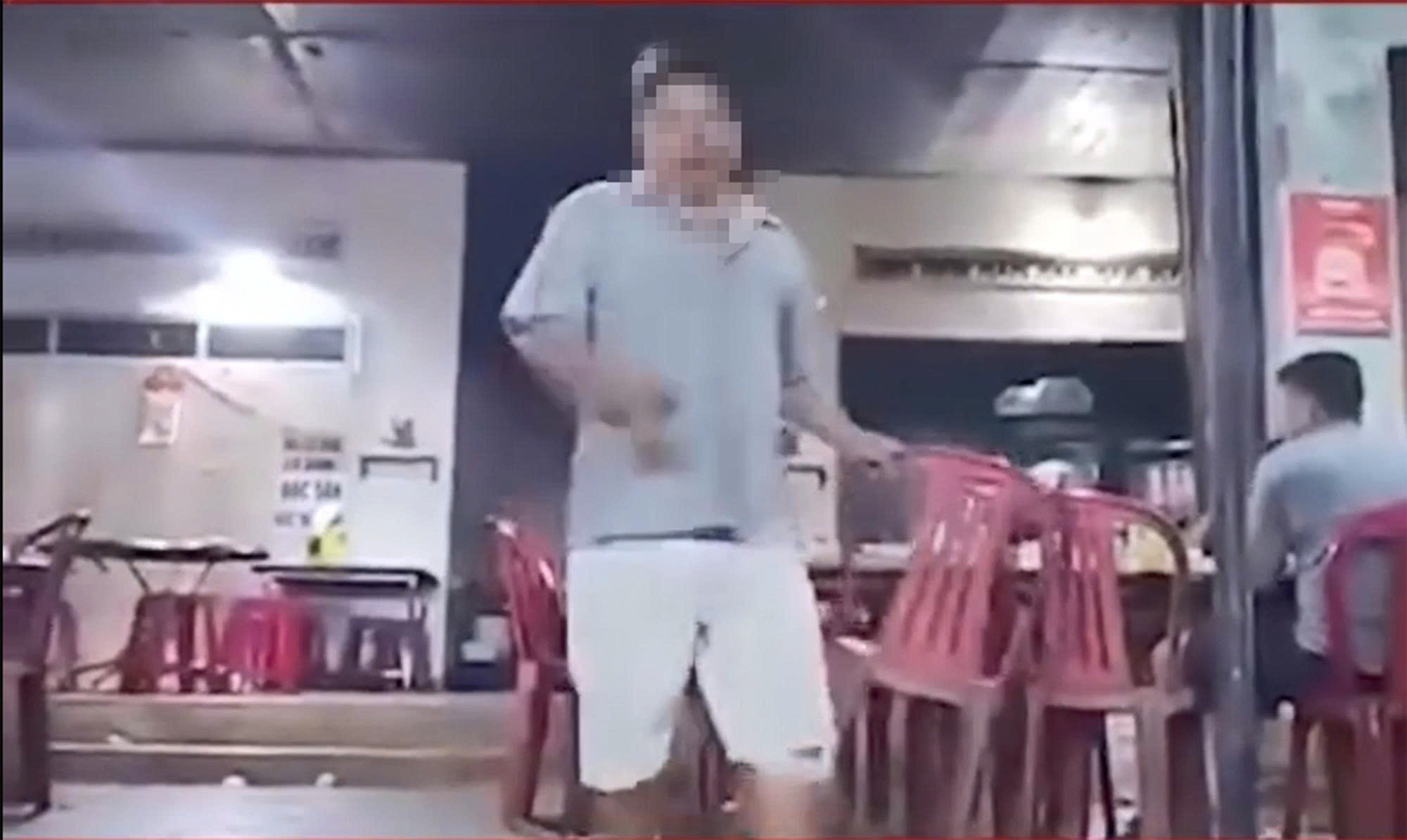 Chủ quán cơm gà 5 Tấn cầm ghế nhựa tấn công khách. Ảnh cắt từ clip