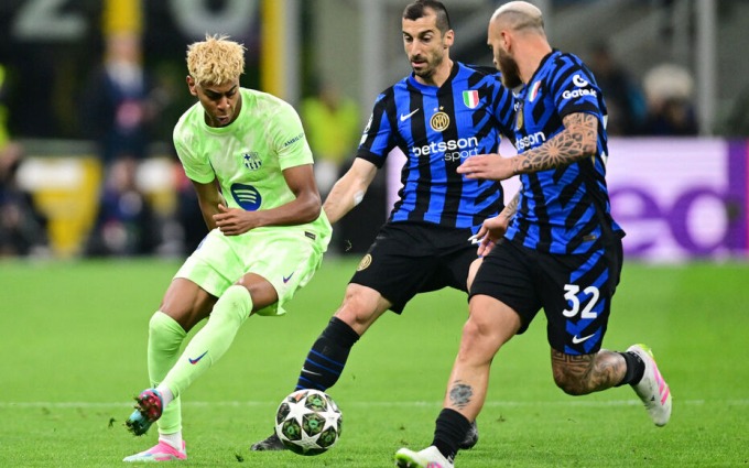 Inter luôn cho hai cầu thủ theo sát Yamal (trái) trong trận lượt về bán kết Champions League hôm 6/5. Ảnh: Reuters