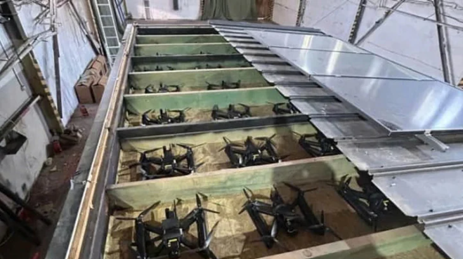 Chúng được chất lên xe tải và đưa đến gần khu vực căn cứ không quân chiến lược của Nga. Nhiều tấm lợp mái của nhà kho được nhấc lên bằng cơ chế kích hoạt từ xa, cho phép máy bay không người lái (UAV) bay ra ngoài và bắt đầu thực hiện cuộc tấn công.