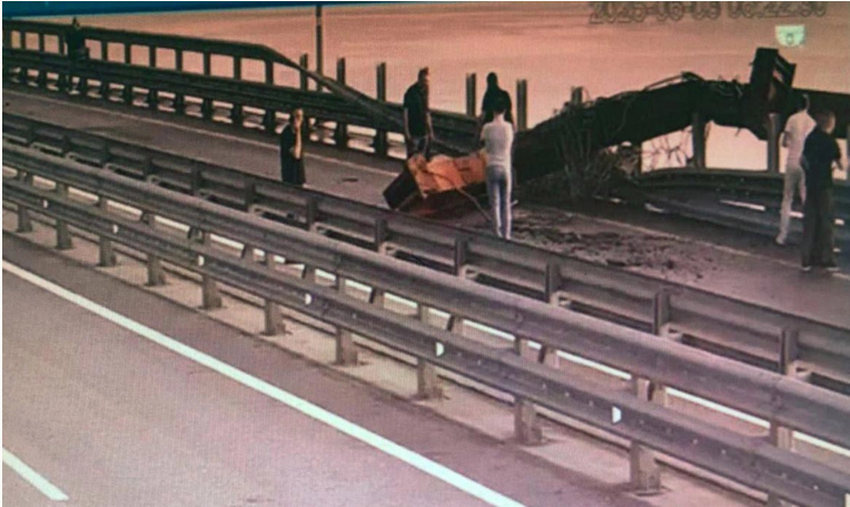Ảnh chụp được SBU cung cấp cho thấy một phần rào chắn và một bộ phận kim loại bị vặn cong. Mặt cầu tại vị trí này bị hư hại một phần, song dường như không có lỗ thủng nào.
