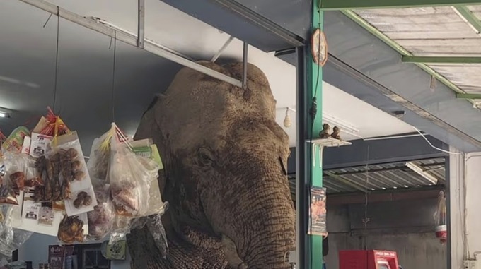 Video đăng trên mạng xã hội Thái Lan hôm 3/6 cho thấy con voi đực đồ sộ có tên "Plai Biang Lek" dừng lại bên ngoài cửa hàng tạp hóa ven tuyến đường gần Vườn Quốc gia Khao Yai ở đông bắc nước này, trước khi cúi mình chui hẳn vào bên trong.