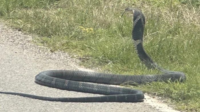 Theo như có một nữ tài xế bất ngờ phải phanh gấp khi chứng kiến một sinh vật khổng lồ trườn qua mặt đường – một con rắn hổ mang chúa dài hơn 3 mét trong lúc đang điều khiển xe ô tô cá nhân trên tuyến đường nông thôn nối từ Ban Wang Bong đến Ban Huai Son (thôn số 7, xã Khuan, huyện Pong), khiến sự xuất hiện của rắn hổ mang chúa này gây ra nỗi lo lắng cho người dân khu vực.
