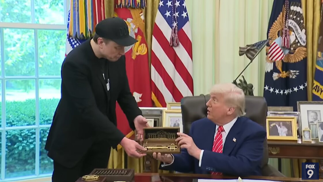 "Tôi không rút lại những gì đã làm, tôi đã đưa cho anh ấy một chiếc chìa khóa, anh ấy đã cố gắng rất nhiều", Trump nói về người đứng đầu DOGE trước đây của mình. Chiếc chìa khóa vàng, được khắc phù hiệu Nhà Trắng, không phải là chìa khóa thực sự nhưng tượng trưng cho sự tôn trọng và danh dự từ tổng thống.