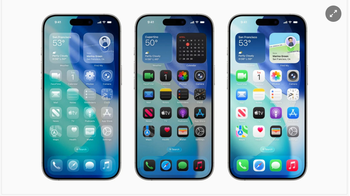 Mở đầu sự kiện, Apple giới thiệu thiết kế mới cho toàn bộ hệ điều hành mang tên Liquid Glass. Phong cách chủ đạo của Liquid Glass tập trung hiệu ứng trong suốt, đổ bóng và mô phỏng kính.
