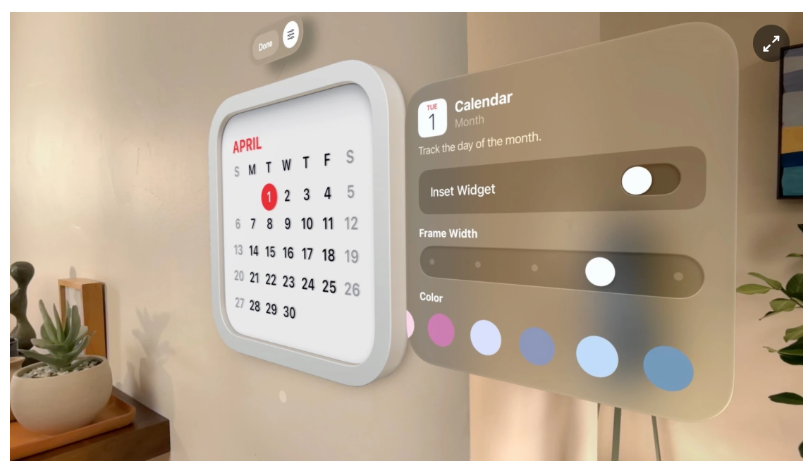 Bản cập nhật tiếp theo cho kính thông minh Vision Pro bổ sung hệ thống widget, có thể “treo” lên không gian xung quanh giống khung tranh. Người dùng có thể tùy chỉnh chiều rộng, màu sắc và chiều sâu widget. Một số widget mặc định như đồng hồ, dự báo thời tiết, nhạc và hình ảnh.