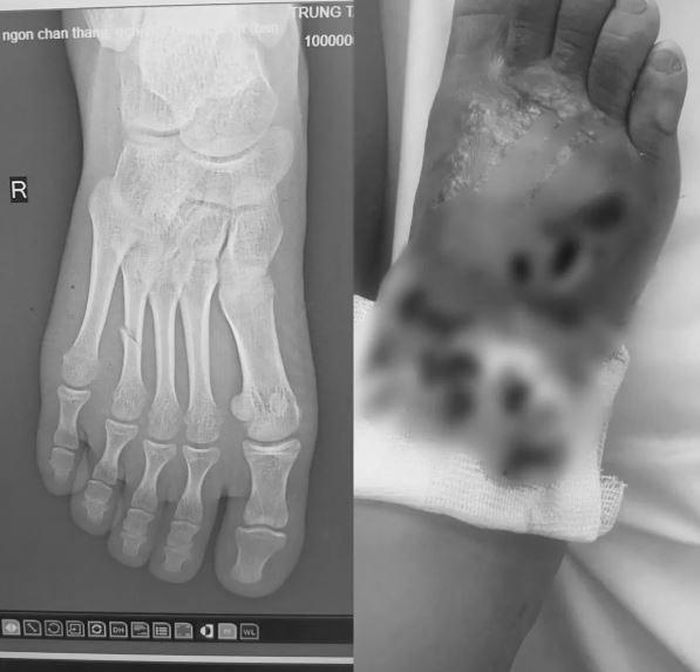 Tại đây, kết quả chụp X-quang cho thấy bệnh nhi bị gãy xương đốt bàn chân, kèm theo nhiễm trùng mô mềm nặng. Các bác sĩ đã tiến hành điều trị kháng sinh liều cao, làm sạch ổ hoại tử và bó bột hở vùng tổn thương. Sau 1 tuần điều trị tích cực, tình trạng nhiễm trùng đã cải thiện, sức khỏe bệnh nhi dần ổn định.