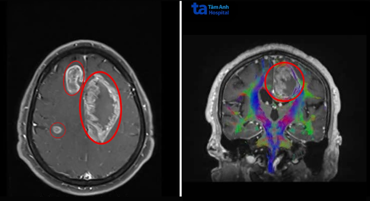 Ảnh chụp MRI 3 Tesla ghi nhận ba khối u lớn (khoanh tròn) trong não ông Giang. Ảnh: Bệnh viện Đa khoa Tâm Anh