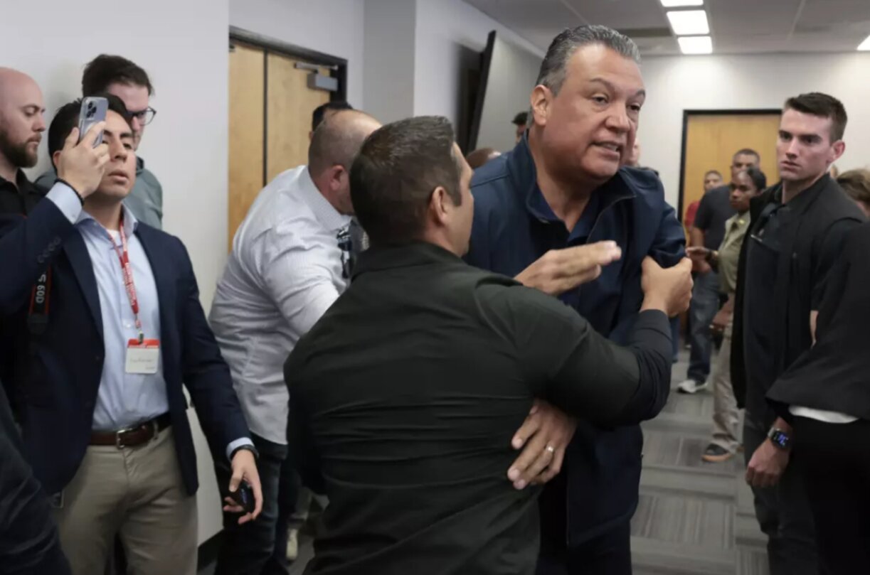 Ông Padilla bị các đặc vụ liên bang kéo ra khỏi phòng họp báo và bị còng tay. Ảnh: Los Angeles Times