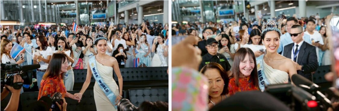 Ngay tại sân bay, hàng nghìn người hâm mộ tại Thái Lan đứng xếp hàng tại sân bay, từ tầng 1 lên tầng 2 để được tận mắt chứng kiến tân Hoa hậu Thế giới. Họ mang theo băng rôn, hoa, quà. Khi đương kim hoa hậu mới xuất hiện, họ vẫy tay, reo hò.