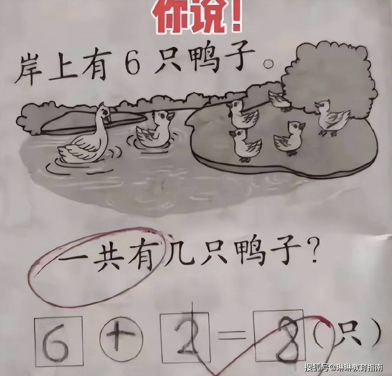 Đề bài yêu cầu: "Trên bờ có 6 con vịt, dưới nước có 2 con. Hỏi tổng cộng có bao nhiêu con vịt?". Bà mẹ tự tin khẳng định với con: "6 + 2 = 8, đơn giản quá mà!".