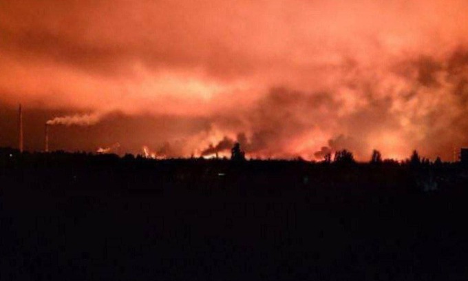 Đám cháy tại khu vực nghi là nhà máy lọc dầu Kremenchuk rạng sáng 15/6. Ảnh: AMK Mapping