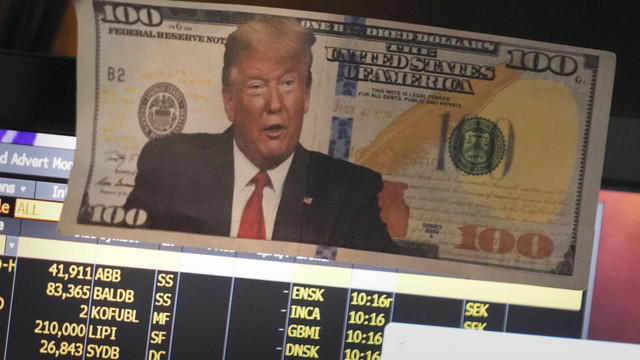 (Ảnh ghép) H́nh ảnh tổng thống Mỹ Donald Trump trên tờ một trăm đô la tại một bài đăng trên sàn của Sở giao dịch chứng khoán New York ở New York, Mỹ, ngày 21 tháng 1 năm 2025. AP - Seth Wenig