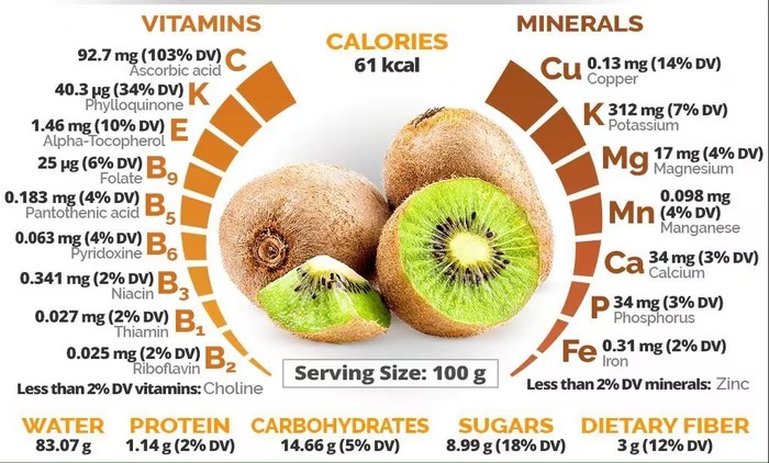 Trong 100g quả kiwi có 34mg canxi. Kiwi có hàm lượng vitamin C cao. Nó cũng chứa vitamin K, E, A và vitamin B, cũng như các khoáng chất như kali và đồng. Nó hỗ trợ ngăn ngừa stress oxy hóa, giảm viêm và bảo vệ tế bào khỏi bị tổn thương.