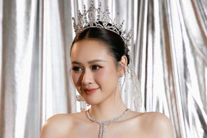 Vedette Anh Phạm đội trên đầu chiếc vương miện lấp lánh, hóa thân thành nàng công chúa trong ngày đặc biệt. Cô cũng đeo vòng cổ dát kín kim cương, bổ sung nhẫn và đôi bông tai phát sáng.