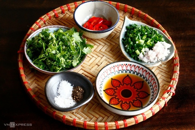 Chuẩn bị gia vị: Hành lá, rau mùi rửa sạch, cắt nhỏ. Hành khô bóc vỏ, băm nhỏ. Ớt bỏ hạt, thái lát. Các gia vị nêm quen thuộc gồm có mắm, muối, bột ngọt, hạt tiêu, đường (theo khẩu vị người Nam Bộ).