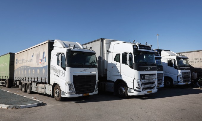 Xe tải chờ ở cửa khẩu Kerem Shalom nằm giữa miền nam Israel và Dải Gaza hồi tháng 5. Ảnh: AFP