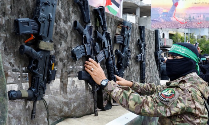 Tay súng Hamas trưng bày vũ khí ở thành phố Rafah ở miền nam Gaza hồi tháng 2. Ảnh: Reuters