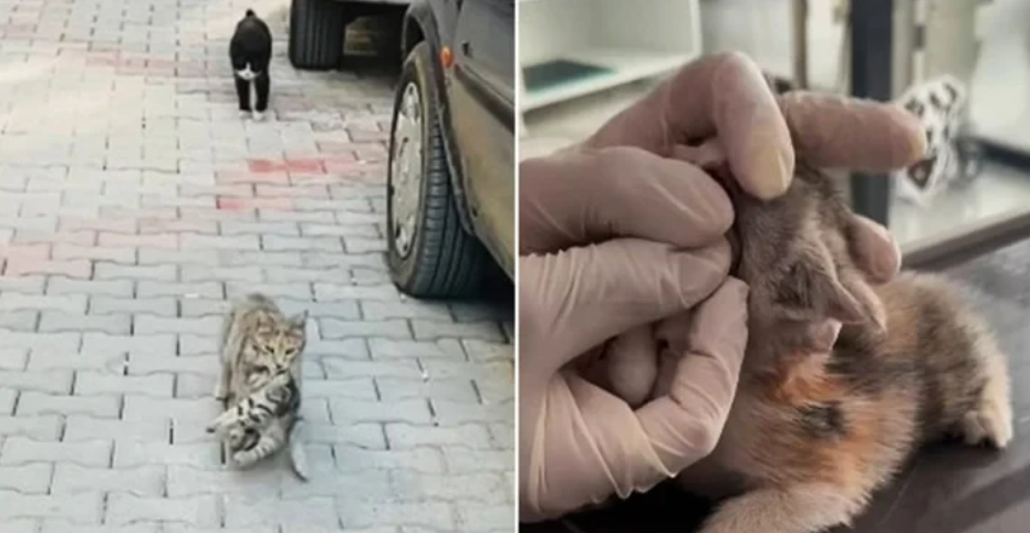 Một đoạn phim được Phòng khám thú y Sungurlu ở Corum, Thổ Nhĩ Kỳ công bố gần đây cho thấy một con mèo hoang dùng miệng tha mèo con ốm yếu đến nhờ bác sỹ giúp đỡ.